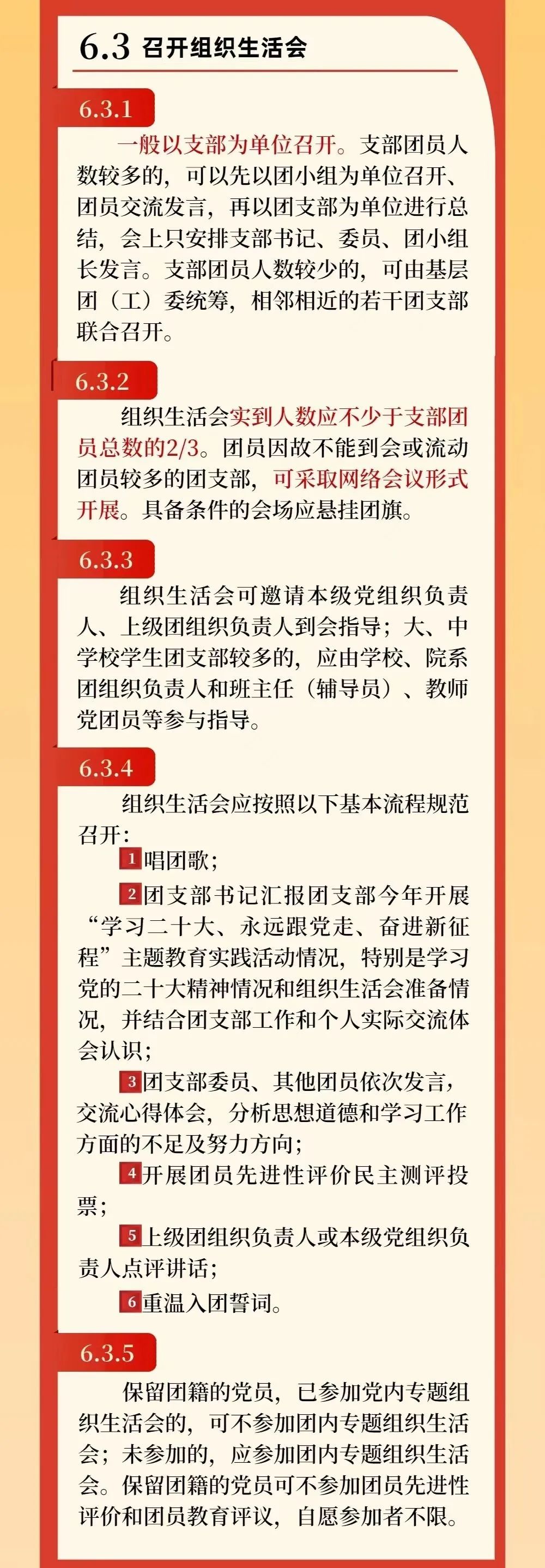 6.3.2 组织生活会实到人数应不少于支部团员总数的2/3。团员因故不能到会或流动团员较多的团支部,可采取网络会议形式开展。具备条件的会场应悬挂团旗。