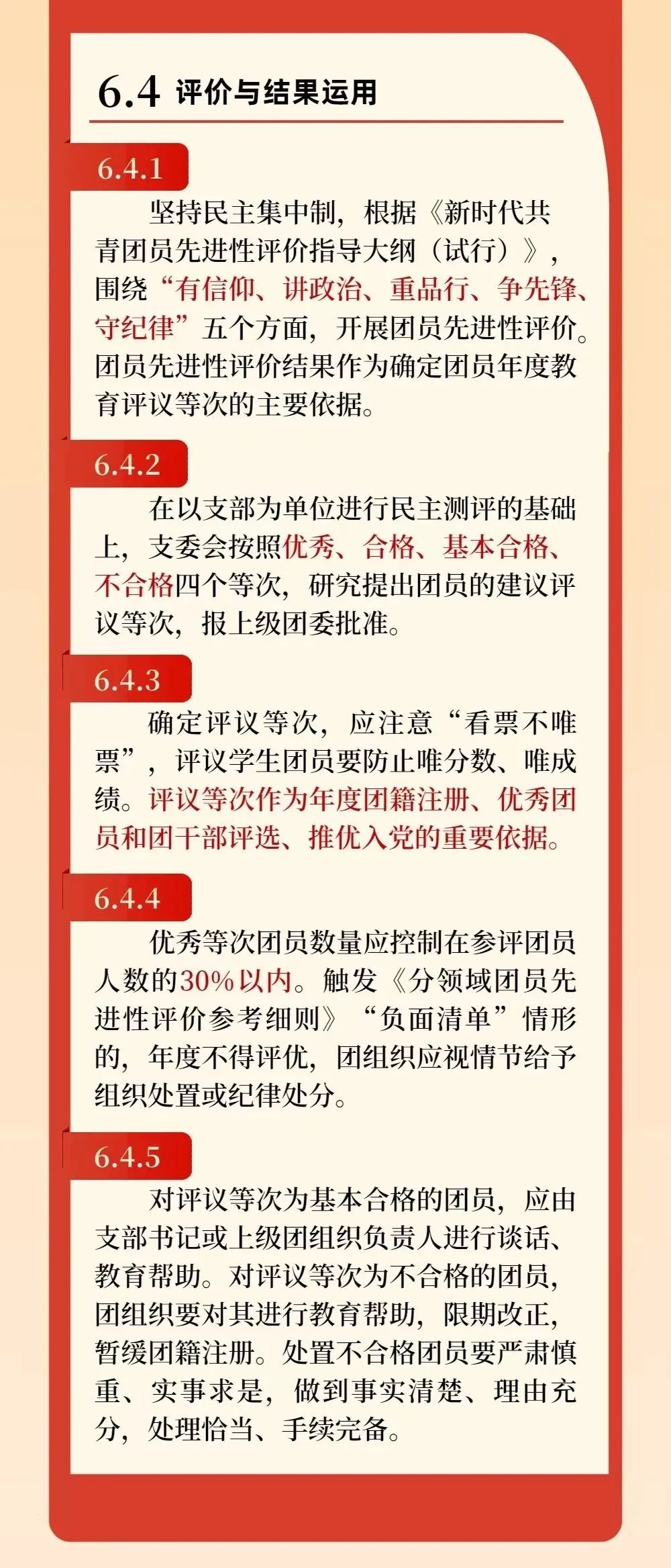 6.4.4 优秀等次团员数量应控制在参评团员人数的30%以内。触发《分领域团员先进性评价参考细则》“负面清单”情形的,年度不得评优,团组织应视情节给予组织处置或纪律处分。