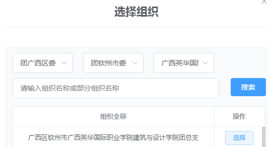 第六步:在申请转入组织,依次选择团广西区委,团钦州市委,广西英华国际职业学院团委,