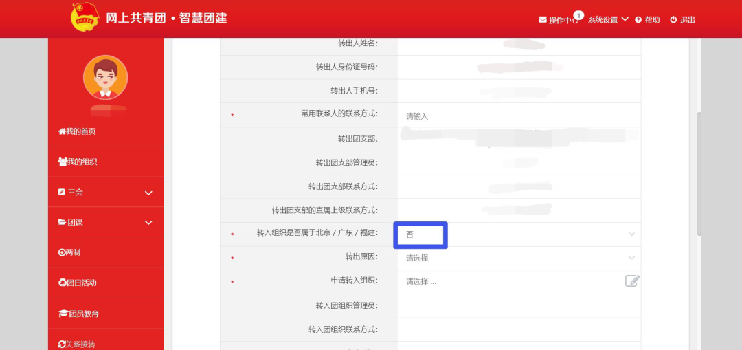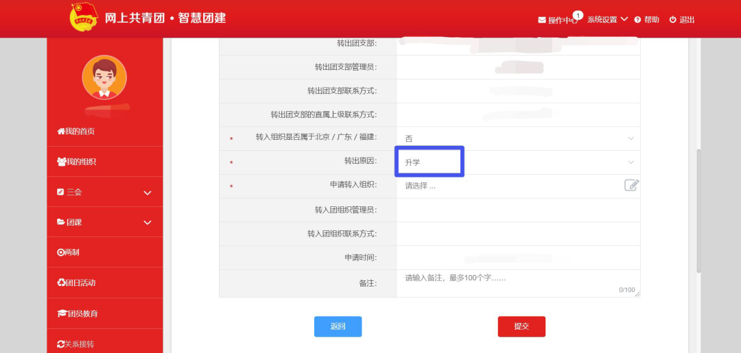 1、团员个人发起申请必须填写联系方式、接转原因、转入组织名称等相关信息(转入组织名称根据个人专业所在学院选择,发起转入之前切记备注好个人的系部和专业,否则将被打回重新发起转入),检查无误后点击提交,等待审批即可。