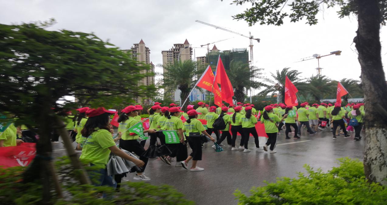 夏天的雨水特别多,倾盆大雨下个不停,早上7:30,同学们冒着雨从学校出发,9:30全民健身活动开始,同学们热情高涨,一只手撑着伞,一只手拿着写有“低碳节能,绿色出行”小旗,参与全民健身活动的还有钦南区、钦北区的各公共机构,1500多人的队伍浩浩荡荡绕着白石湖健步走。雨水在小道上汇集成一条条小溪。同学们衣服和鞋子湿透了,也丝毫不在乎,纷纷表示雨天的白石湖格外美丽,这样的绿色出行方式很“时尚”,也很惬意,可以和身边的朋友聊聊天,欣赏美丽的风景,时间一下子就过去了。
