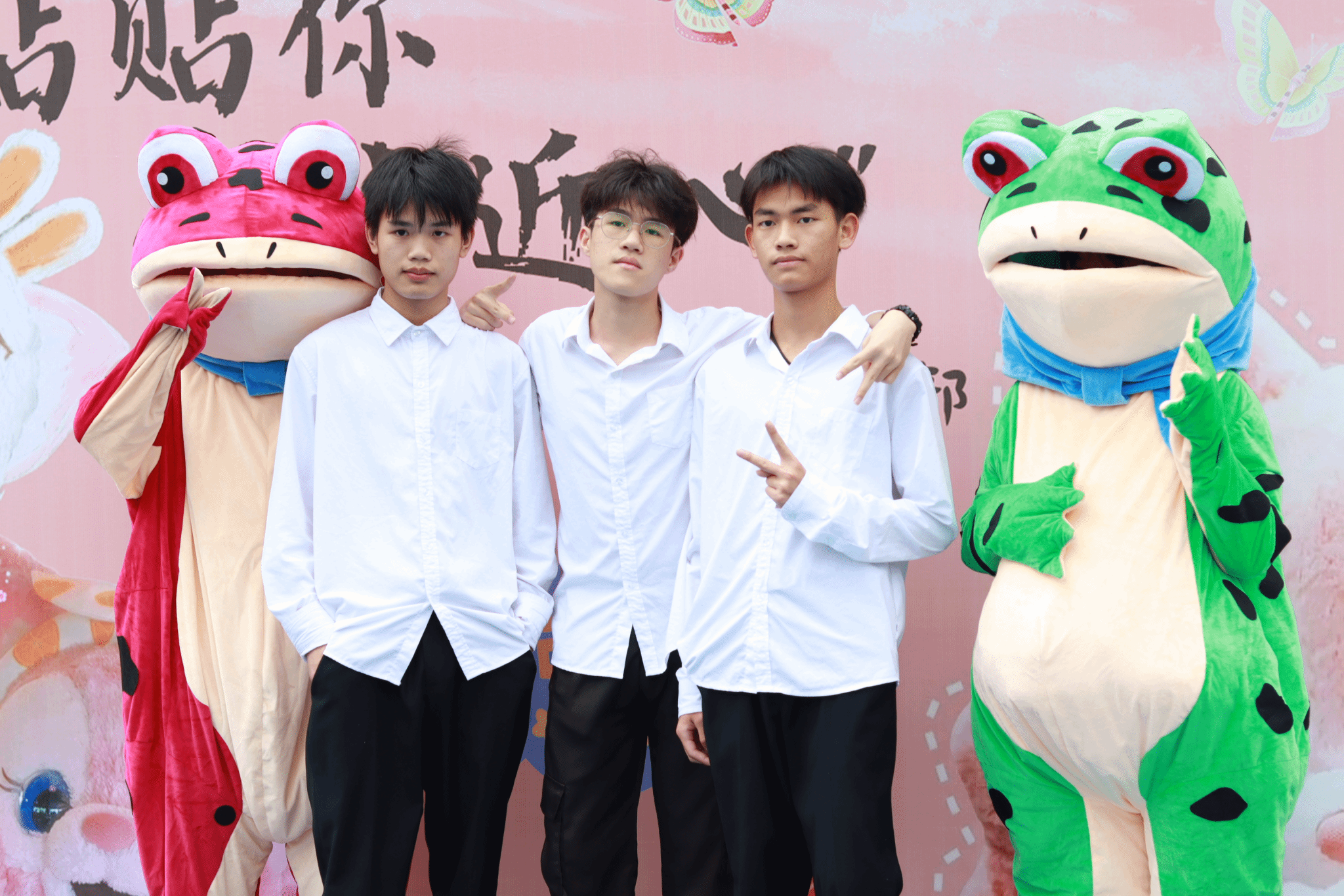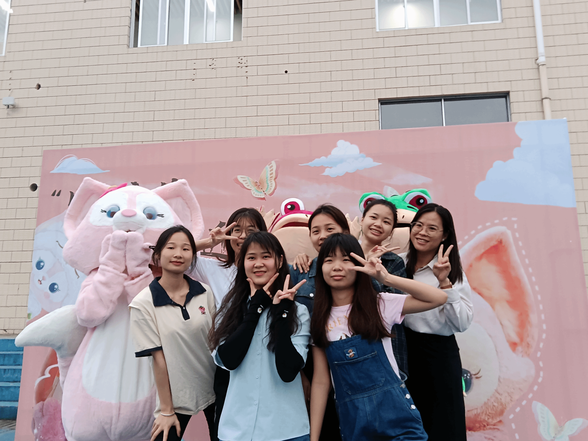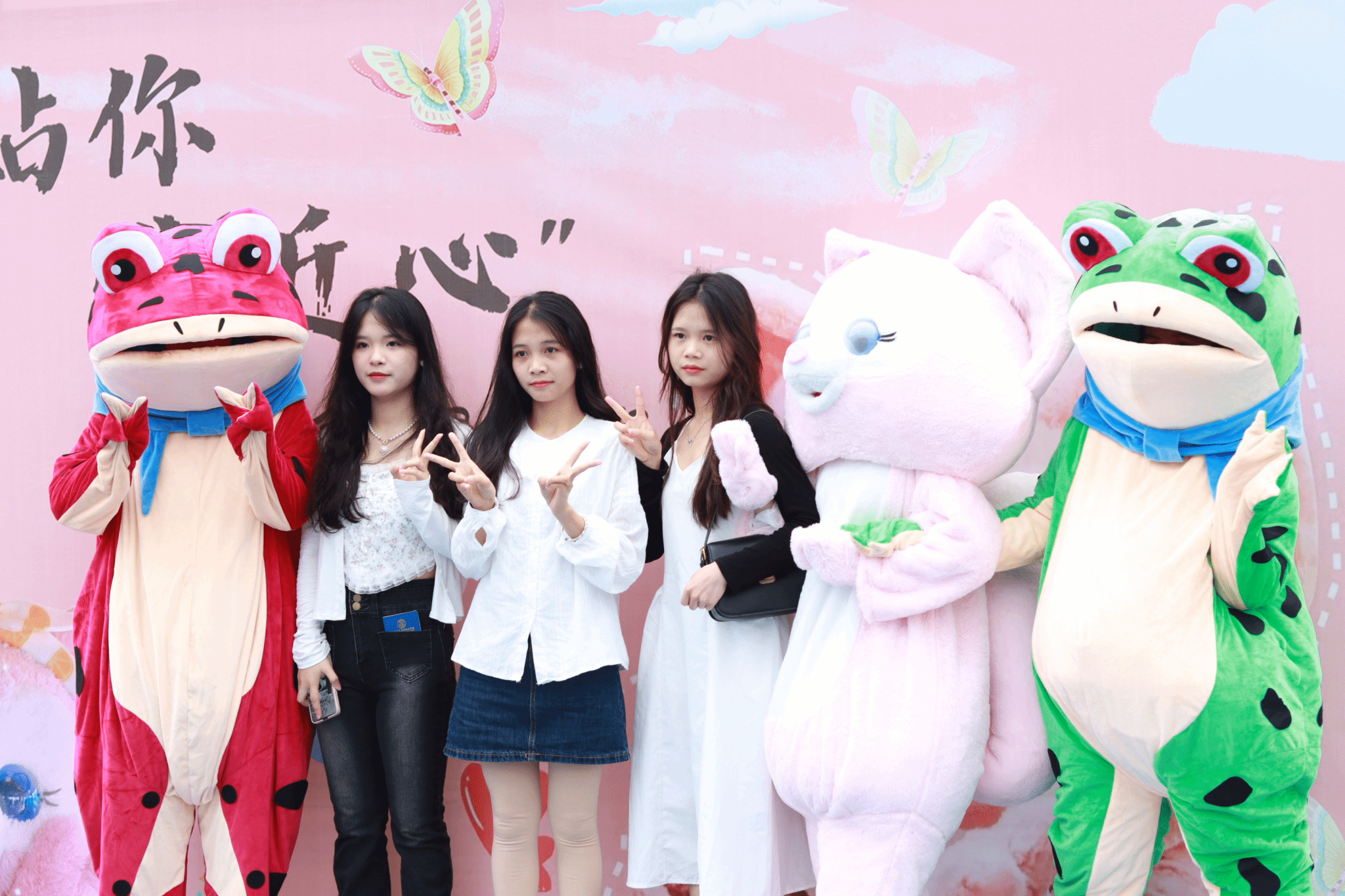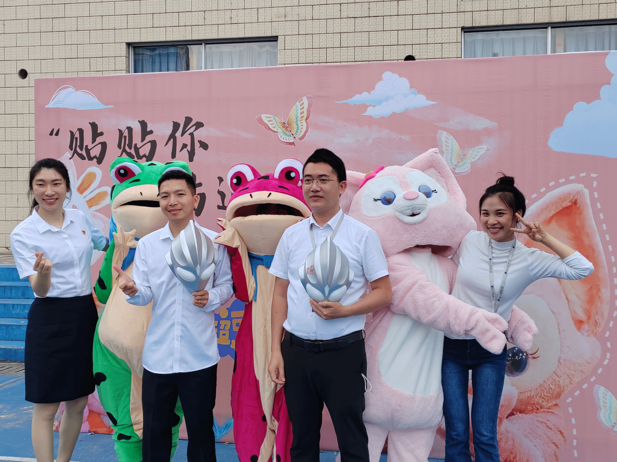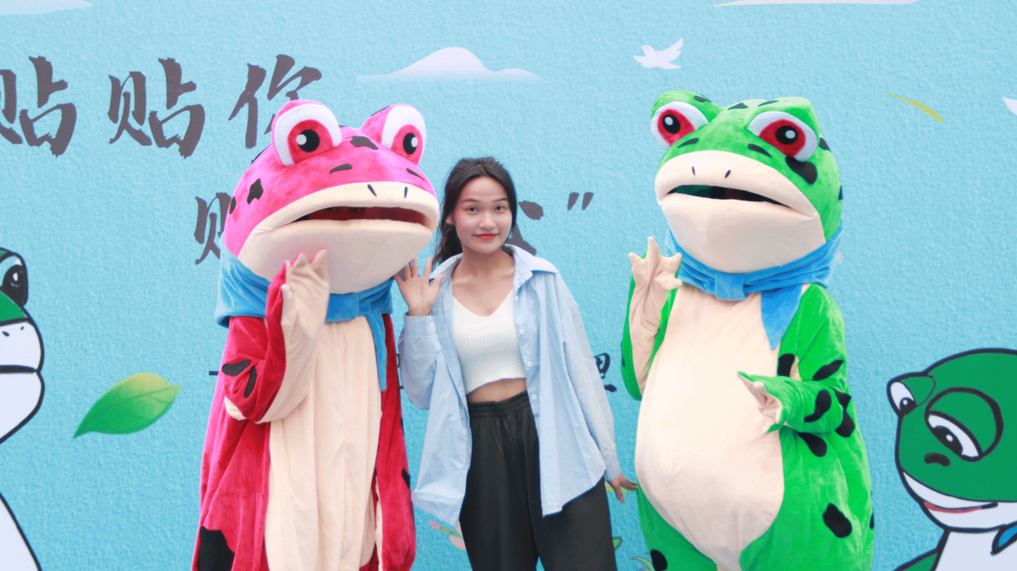 在活动过程中,工作人员穿上可爱的玲娜贝儿和呱呱青蛙玩偶服,俏皮可爱的外表吸引了同学们的目光,玩偶们与前来参加活动的同学互动,其张开双手的姿态也得到了观众的温暖回应与爱的抱抱。