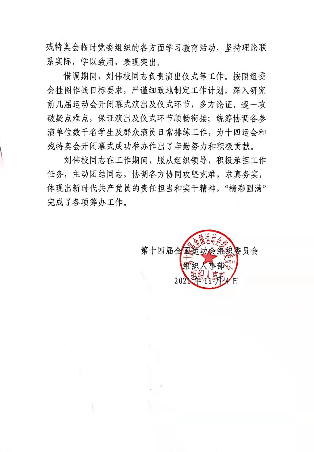 根据十四运会和残特奥会组委会工作安排,我院刘伟校老师于2021年3月至2021年11月参与十四运会和残特奥会组委会大型活动部工作。刘伟校老师借调期间,担当尽责、忘我工作,出色完成各项工作任务,得到组委会的充分肯定。 2021年两个季度考评为“好”等次,荣获组委会“奉献全运之星”称号。