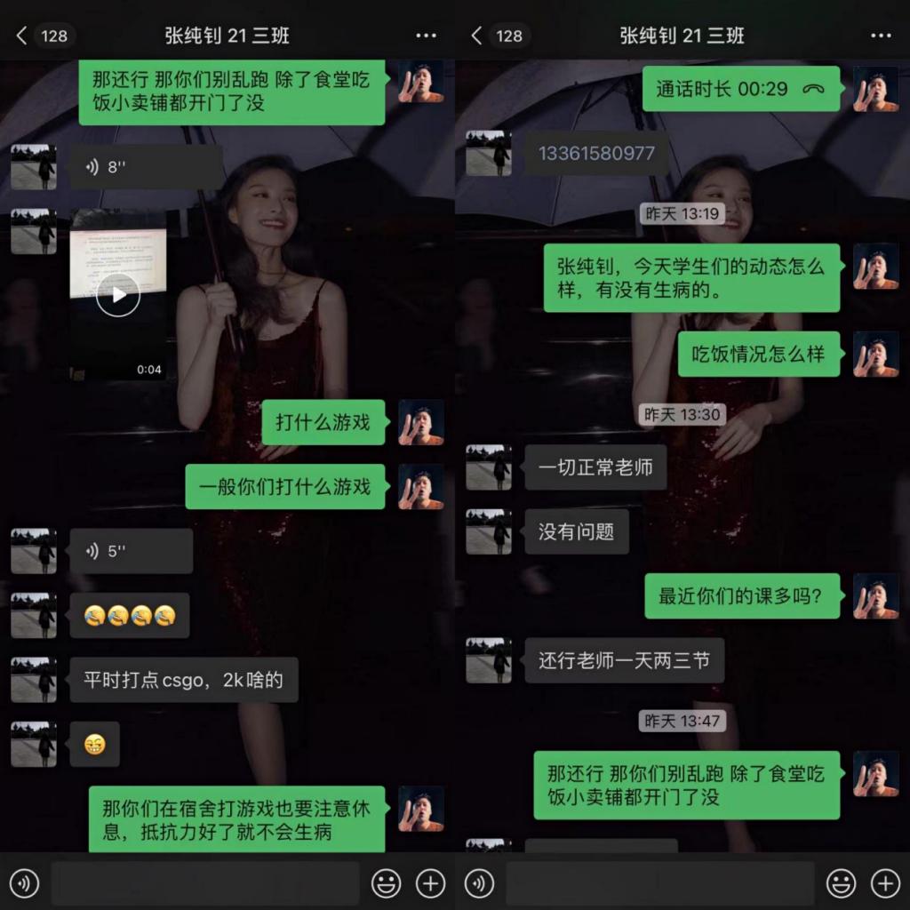 为进一步贯彻落实学生在校封闭期间生活学习情况,通过微信平台进行了“云”走访。用“屏对屏”方式了解学生目前封闭期间生活及学习具体情况,为学生尽可能的解决问题,对有特殊需求、急需解决的做以统计,立即上报学院。同时嘱咐学生做好疫情防控防护,遵守学校要求,每天按时完成核酸检测,勉励学生封闭期间调整心态,认真学习,完成本学期各科课程。虽然受到了疫情封闭的限制,但我院师生隔空不隔爱。线上的走访不仅为同学们送去了学校的深切关心和殷殷期望,还拉近了师生之间的距离,同时为进一步加强学生管理和疫情期间个人防护提供了依据。
