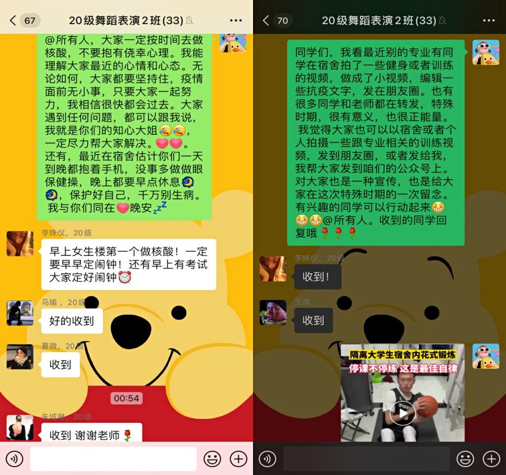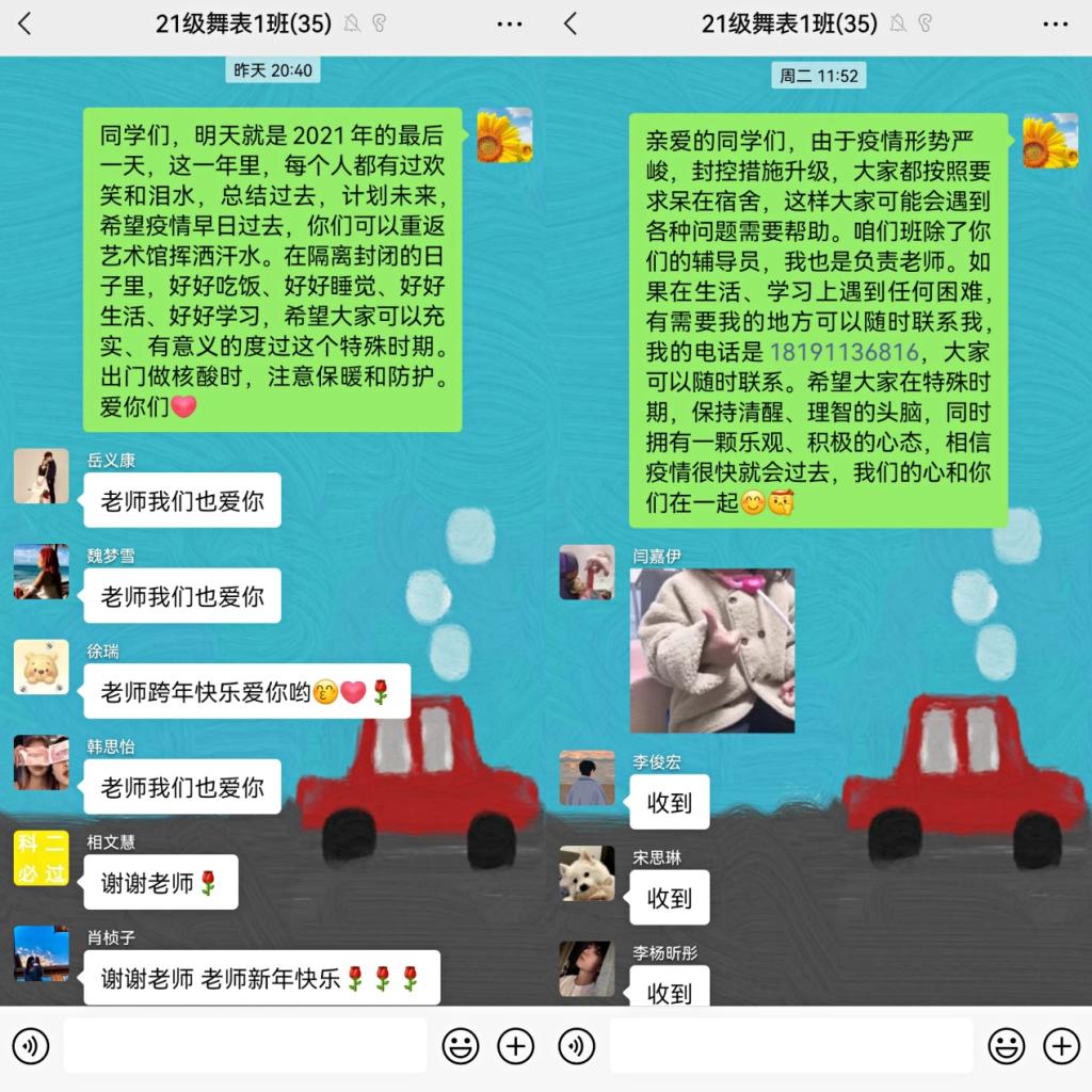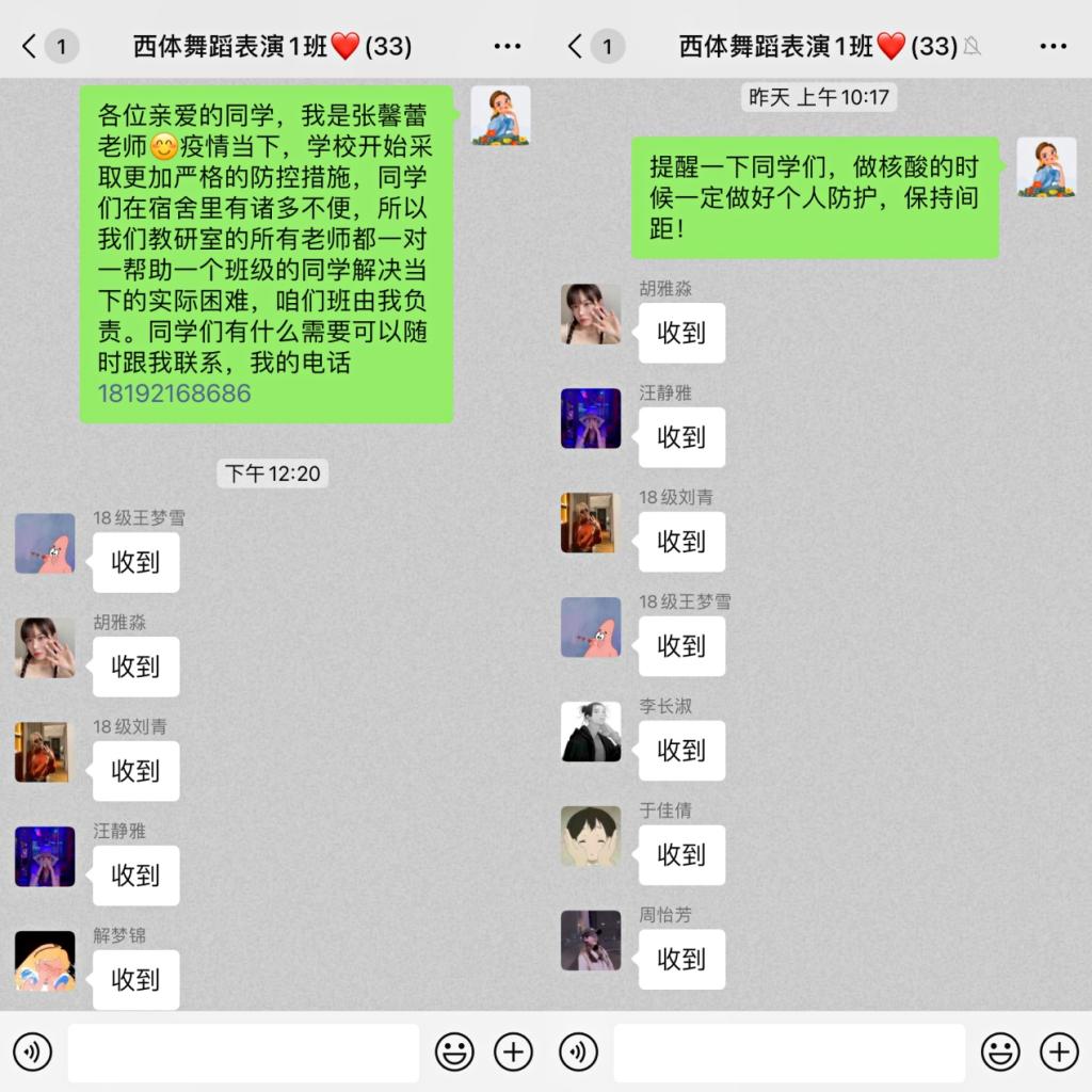西安的疫情牵动着我们每个人的心,同时也被封闭在家,尤其是在学校的学生们,他们的活动空间小,环境不比在家里,难免在心态和心情都有影响。我们每个老师负责一个班学生,对学生们进行心理疏导与关心,通过微信群、腾讯会议等平台对学生进行了互动,尽可能了解学生目前的生活及学习情况,给予力所能及的帮助,对有特殊需求、急需解决的做以统计,立即上报学院。同时也会叮嘱学生做好隔离期间的个人防护,遵守学校要求,每天按时完成核酸检测,并将结果发到群里,勉励学生封闭期间调整心态,认真学习,完成本学期各科课程。停课不停学,隔离不隔心。我们的一句关心和问候会给学生很大的鼓励。这次的线上交流不仅是为了防护疫情。更是一次拉进师生之间的关系的特殊纽带。有人负重前行,有人为民而战,我相信,我们很快就能战胜病毒。西体,加油!