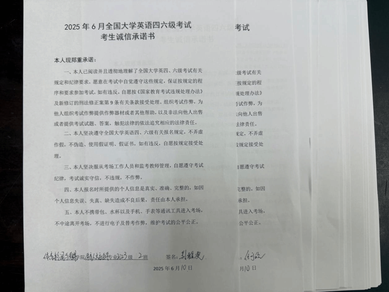 最后,与会同学共同签署了《2025年6月全国大学英语四六级考试考生诚信承诺书》。