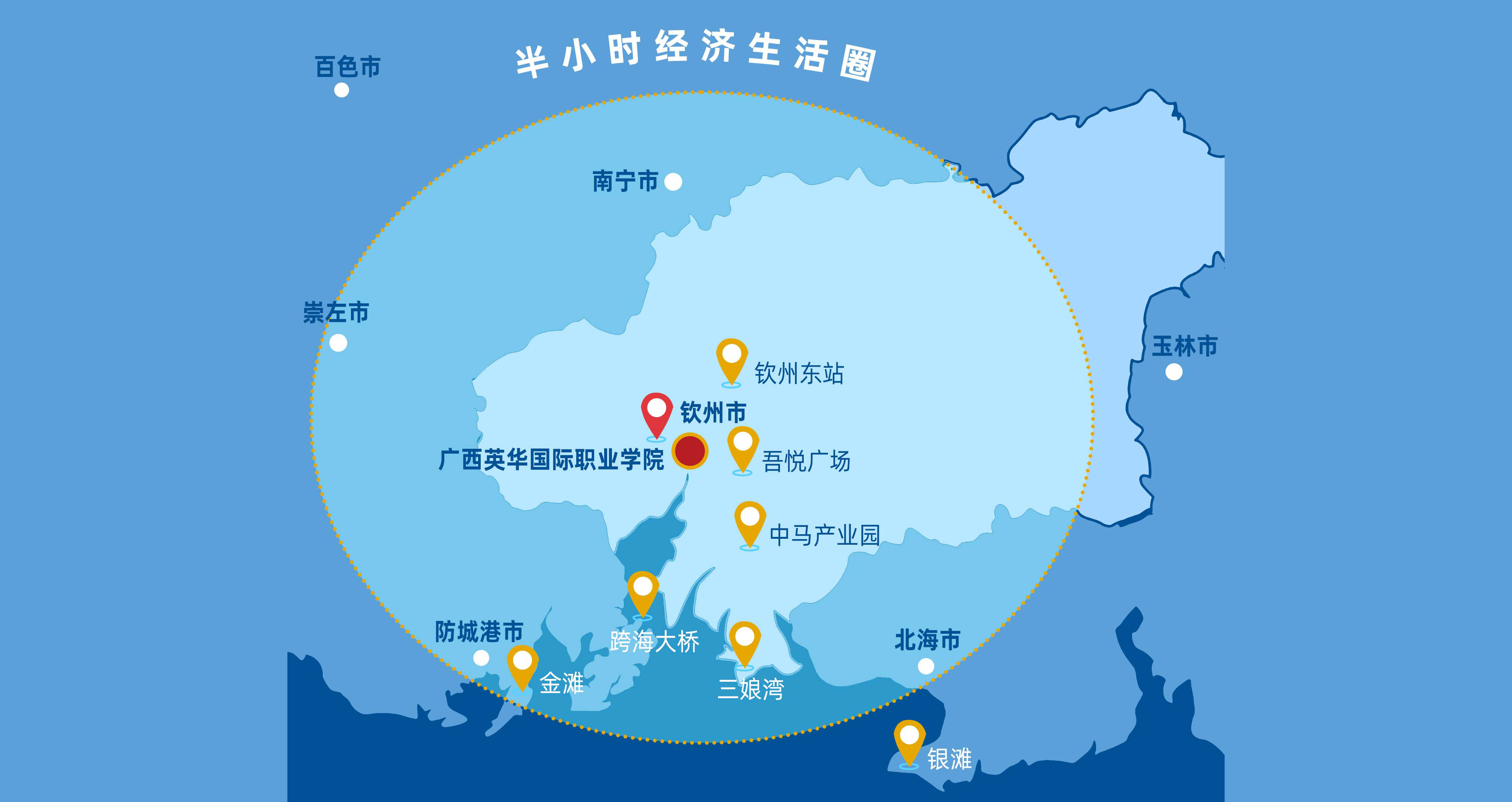 学校位于西部陆海新通道重要枢纽城市、北部湾经济区滨海城市--钦州市,它集沿海、沿江、近边三位于一体,地处中国西南经济区、华南经济圈、东盟经济圈的结合部,背靠大西南,面向东南亚,海陆空立体化交通发达。