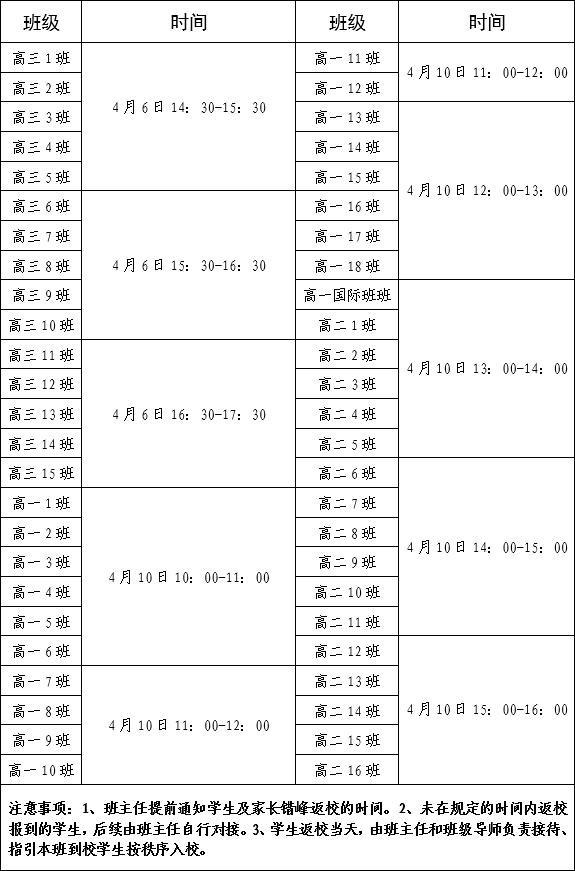 附:各年级、班级返校时间安排表