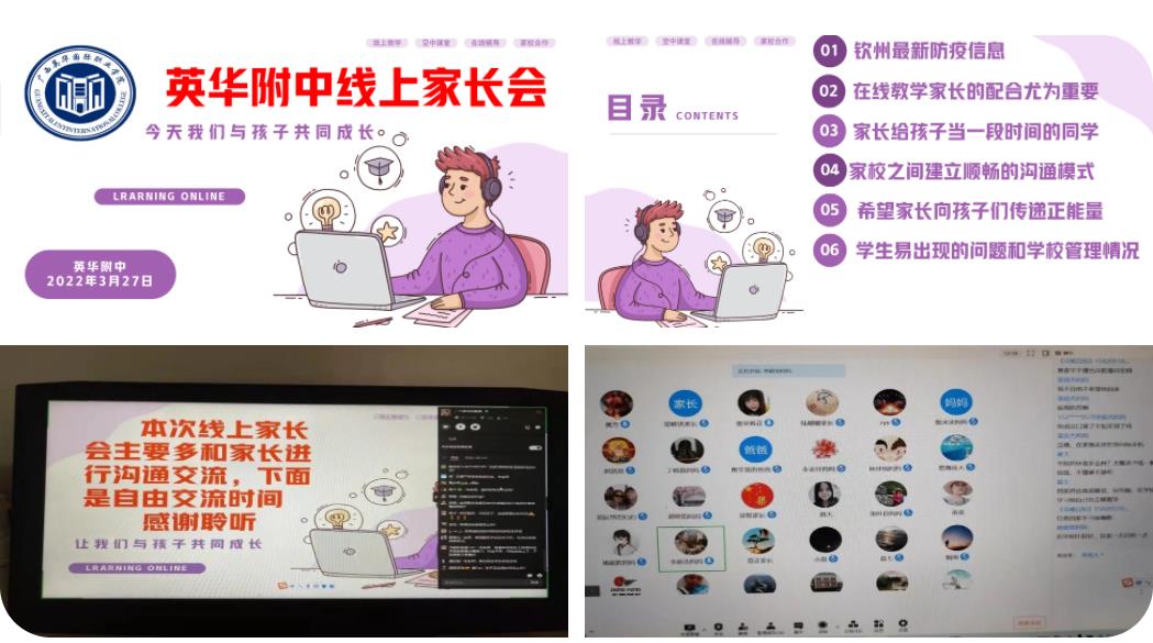 在疫情的考验下,我校师生上下一心、齐心协力迎接挑战、克服困难,在抗击疫情的同时有条不紊的开展各种教学活动,为增强学校、教师、家长之间的沟通,让家长朋友们充分了解疫情期间子女在校学习、生活、纪律情况,从而让家长和学生更好地配合学校开展教育和防疫工作,形成有效的“家校共育”教育格局,共同促进学生健康成长,我校于2022年3月27日召开了主题为“疫情期间,让我们与学生共同成长”的线上家长会。