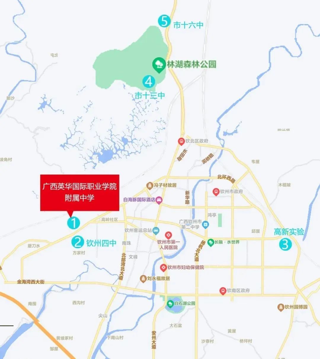 学校位于钦州市钦南区南珠西大街188号,距离市中心和主要商业区仅3公里的距离。无论学生居住在城区还是附近郊区,都能方便快捷地抵达学校。这样一来,在上下学时段就可以避免长时间的通勤,从而有更多时间用于学习和休息。尤其是在高中备战阶段,学生复习时间紧迫。当别人还在路上奔波时,你可能已经在家或学校里做了几道题或者完成了几张卷子。