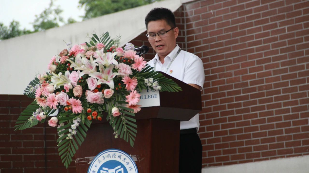 本次典礼由彭慧玲老师主持,出席本次典礼的领导分别是:广西英华国际职业学院校长邹利斌、广西英华国际职业学院附属中学副校长陈汝毅、附属中学党支部书记陈诚、附属中学教务主任陈升、附属中学团委书记杨婷婷、高三年级主任韦珊妮、高二年级主任苏德宽。