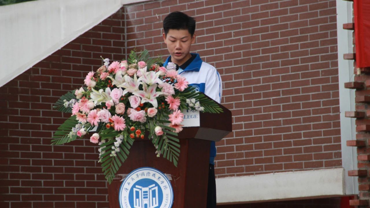学生代表白云龙以“新高考 新挑战 新使命 新希望”为题,向全体高二高三同学提出号召,作为广西实施新高考的第一届学生,我们要为自己设定理想的大学目标。要有为目标坚定付出的恒心,要有“咬定青山不放松”的韧劲,要有“乘风破浪会有时,直挂云帆济沧海”的决心,考上理想大学,实现人生价值。将过去的失败和挫折当成一种动力,把握每一个机会去奋发学习。