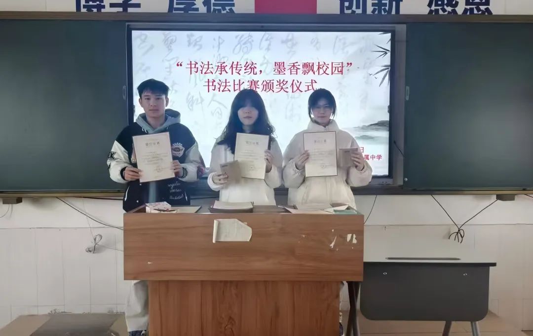 在这些同学们的作品中,我们看到了你们对传统文化的热爱,对书法的执着追求,以及对世界的好奇与探索。你们的才华和努力,不仅让这份荣誉实至名归,更让我们的校园文化因你们而更加丰富多彩。请接受这份荣誉,它是对你们过去努力的肯定,也是对未来无限可能的期许。愿你们在接下来的学习生活中,继续保持这份热情和创造力,用笔墨书写更加灿烂的明天!