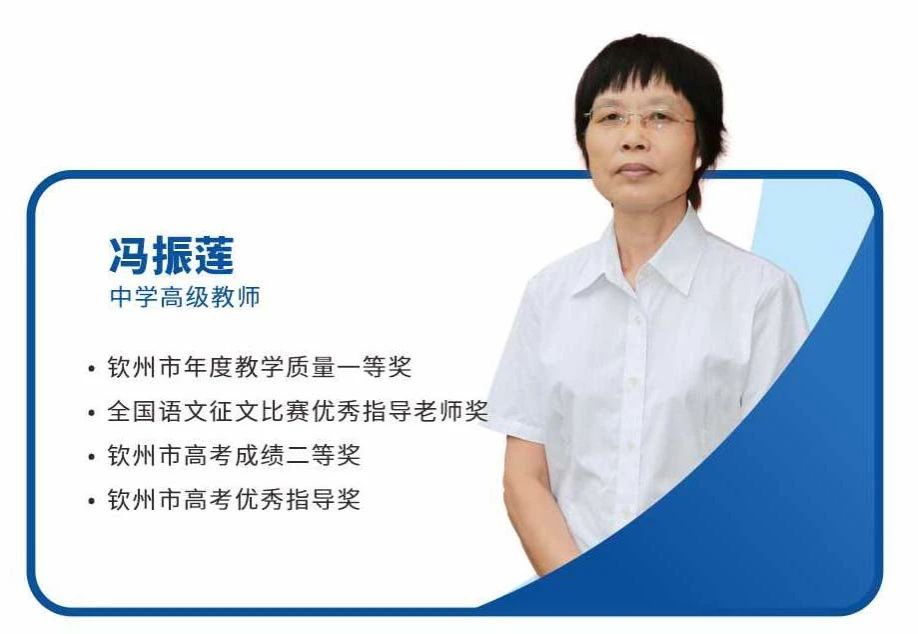 冯振莲老师作为中学高级教师,她耕耘于教育事业长达36年之久。原任教钦州市第一中学,因深入浅出的教学方法广受赞誉,退休后返聘至英华附中担任语文学科教师已有5年。冯老师辛勤付出和卓越成就:荣获钦州市年度教学质量一等奖,全国语文征文比赛优秀指导老师奖,钦州市高考成绩二等奖,钦州市高考优秀指导奖。通俗易懂的教学风格,让很多学生在语文学科中取得优异的成绩,帮助英华学子圆梦考入兰州理工大学、云南大学、上海交通大学和郑州大学等知名高校。