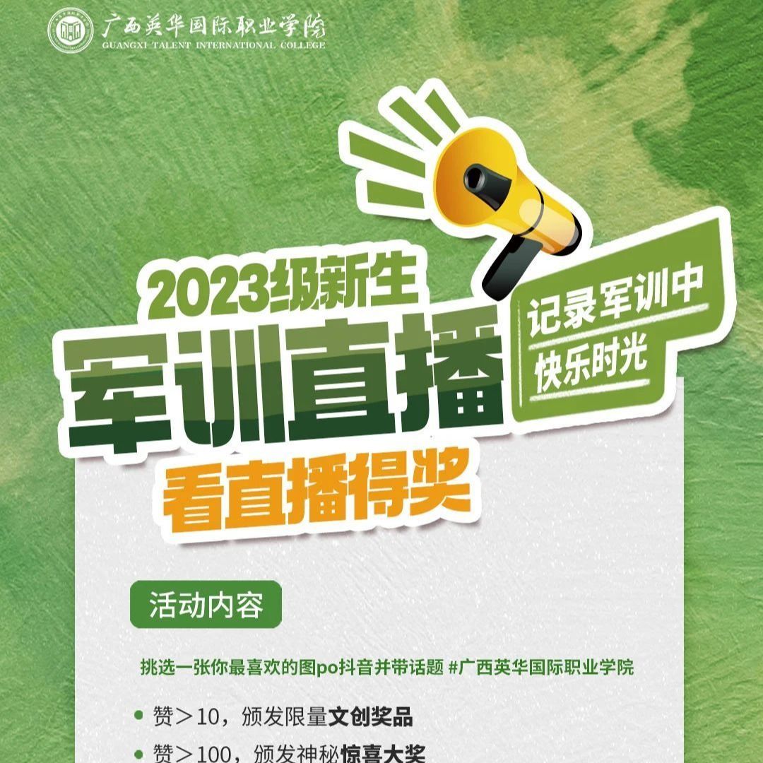 广西英华国际职业学院全程直播2023级,挑选一张你最喜欢的图po抖音并带话题 #广西英华国际职业学院,有机会领取神秘大奖。