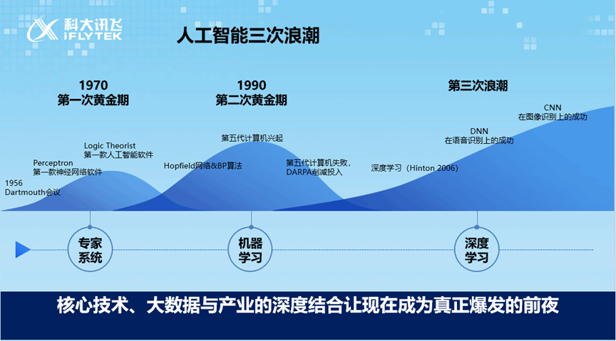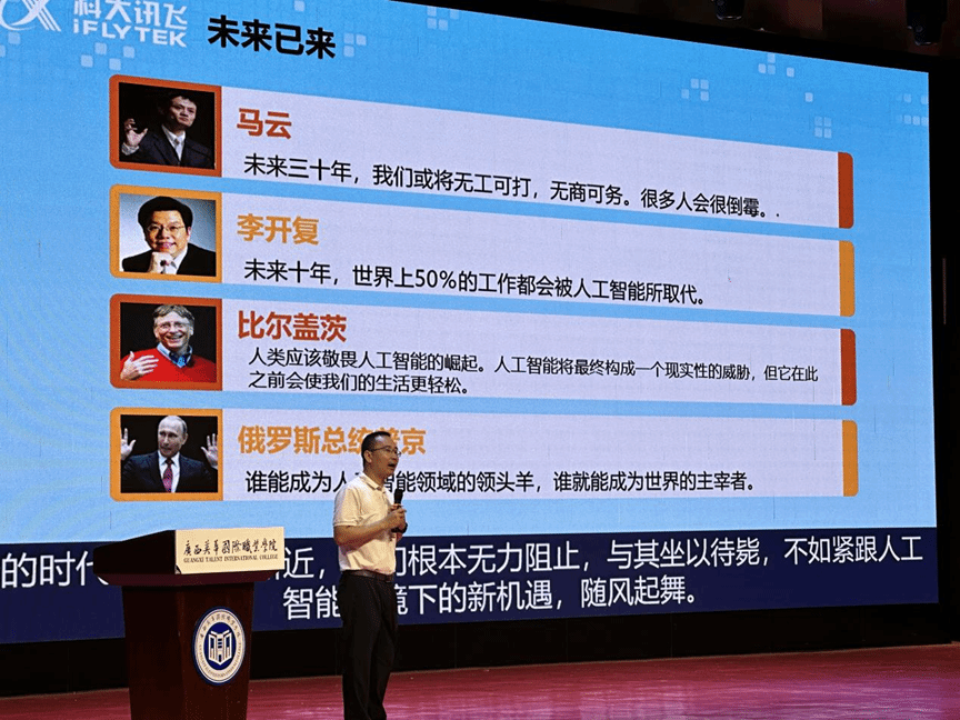 讲座现场,莫小泉老师围绕“目前信息技术发展趋势及产业变革、软件开发历程及思考、大数据与AI、大数据与AI时代市场需求”四个方面进行,以他所处岗位具备的成熟经验和开阔视野来为同学们进行行业知识传导。莫老师带着同学们逐步了解人工智能的发展历程,介绍了人工智能的三次浪潮,AI技术在各个领域的应用,国家对人工智能产业的政策支持等,并向同学们介绍科大讯飞在人工智能领域雄厚的研发背景和领跑地位。