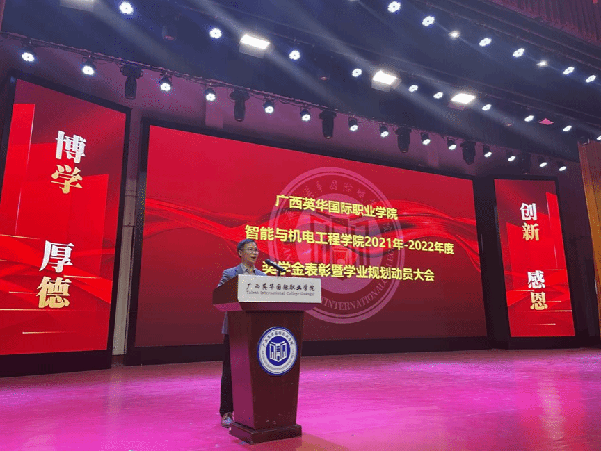 2023年3月12日下午,智能与机电工程学院于报告厅隆重举办2021年-2022学年国家奖学金表彰暨学业规划动员大会。广西英华国际职业学院副校长赵春辉,智能与机电工程学院院长邹才深,学院书记、副院长邹芸芸等领导出席本次大会,参加本次大会的还有智能与机电学院全体师生。