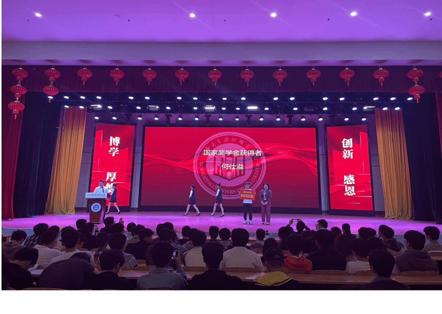 随后,荣获国家励志奖学金的秦惠海同学上台发表了获奖感言,表达了对党、国家、学校、老师和同学的感恩之情,分享了自己的学习经验,他表示作为新时代的新青年,将在以后的学习生活中,把荣誉化作今后奋斗的不竭动力,立志在建设祖国的历史进程中勇挑重担,实现人生的价值。