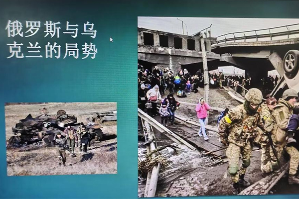 根据党的二十大精神中关于“国际国内安全形势的深刻分析”指示,我院学生更加关注国内国际安全,通过课前三分钟展示分析“俄乌冲突”局势,提醒身边的同学,作为当今新时代的青年学生要时刻牢记我们现在的和平生活是来之不易的,要懂得珍惜和平、维护和平,并呼吁所有同学要铭记历史、勿忘国耻,珍爱和平、努力学习,传承好中华民族优秀美德,在持续的奋斗中创造更美好的未来。
