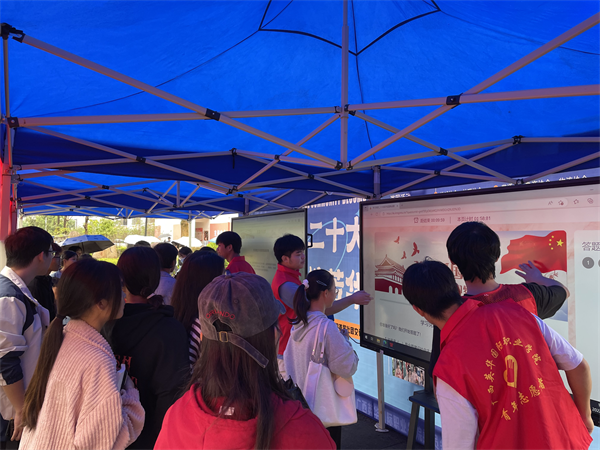通过精心准备,此次活动布置了两台触控式电视,嵌入软件技术专业学生自行编写的比赛程序,题库共提供200余道党政知识题,分有“青铜”和“王者”两个赛区,系统会从题库中随机抽取2道和5道题给予参赛者作答,全部答对者,可领取相应的精美奖品。活动一经推出,便吸引众多学生驻足参与答题,师生参与量近800人。